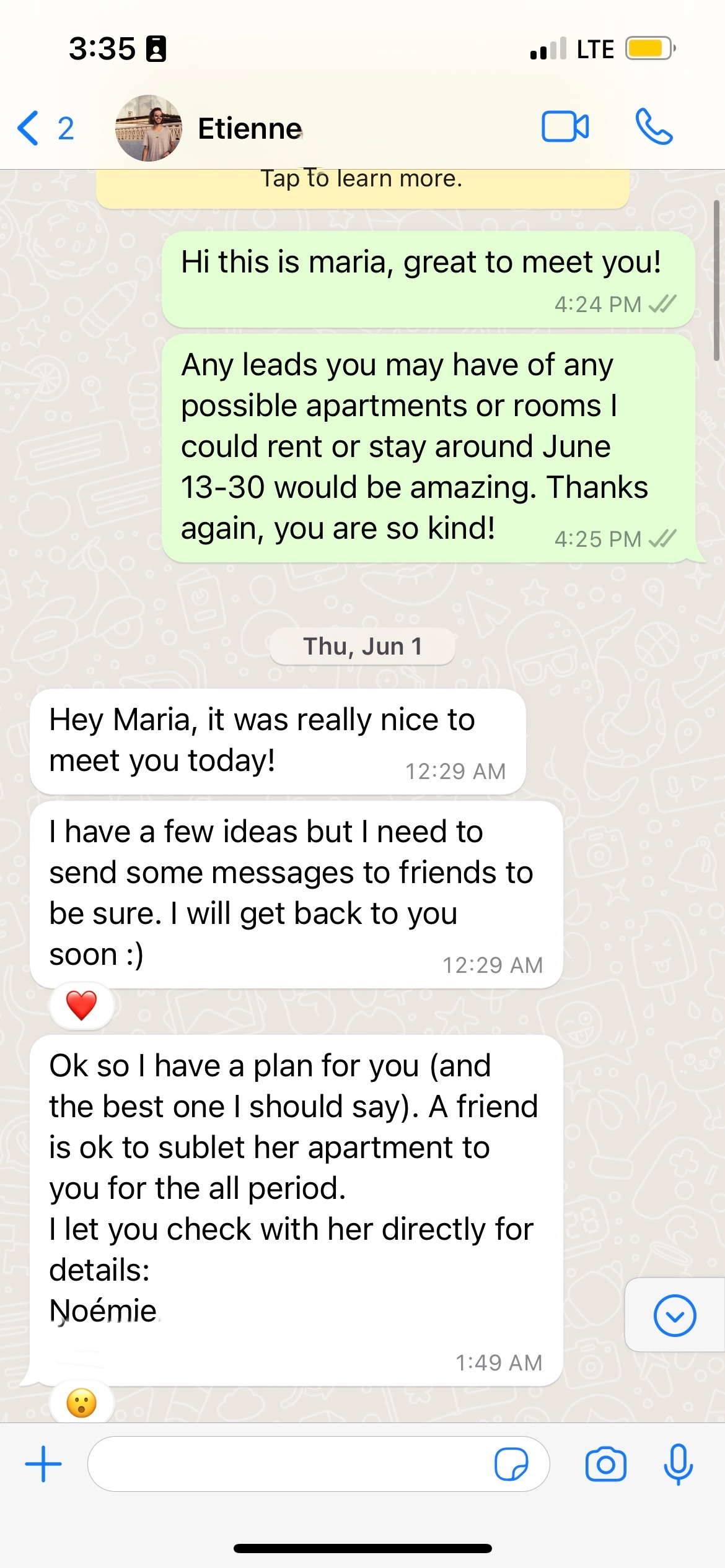 “Ok, so I have a plan for you (and the best one I should say). A friend is okay to sublet her apartment to you. I’ll let you check with her directly… Honestly, it’s the most beautiful flat I have seen in Paris. I think you’re gonna love it!!”