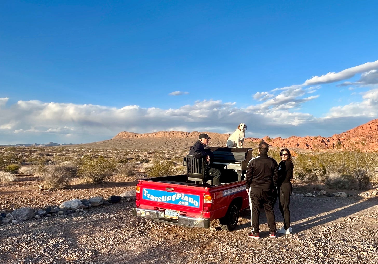 With tired legs after the hikes, we decided to squeeze in one last lookout point to see ancient petroglyphs. That’s when we saw him. The man playing piano in the bed of a truck with a dog perched on top.