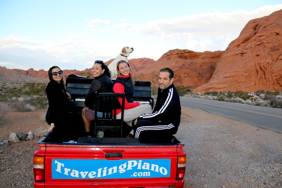I reviewed the scene in my head— four strangers on the back of a pickup truck, playing the piano without knowing how to play the piano, with a dog perched on the mantle of the instrument, guided by a man we just met. Meanwhile, the sun set spectacularly behind the ridge of the red mountains. Meanwhile, our other friend snoozed in the car unbeknownst to what was going on.