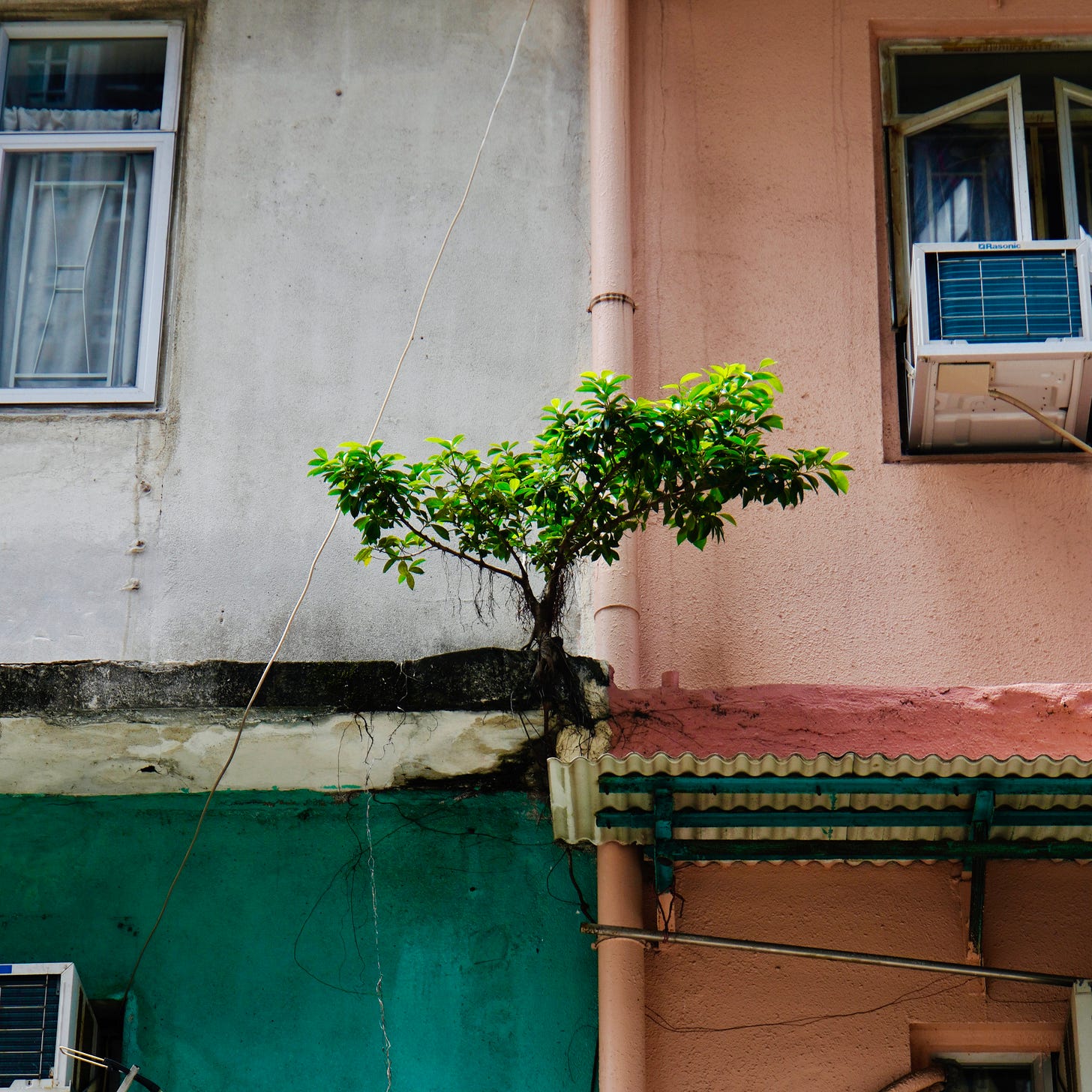 A thriving tree grows sandwiched in between slabs of cement buildings in the middle of a concrete metropolis. There's not an inch of soil and not a single other tree in sight. Yet it’s growing despite all logic that says that's not a place for a tree. A tree whose roots are shared by both buildings. Both buildings keep it alive somehow.