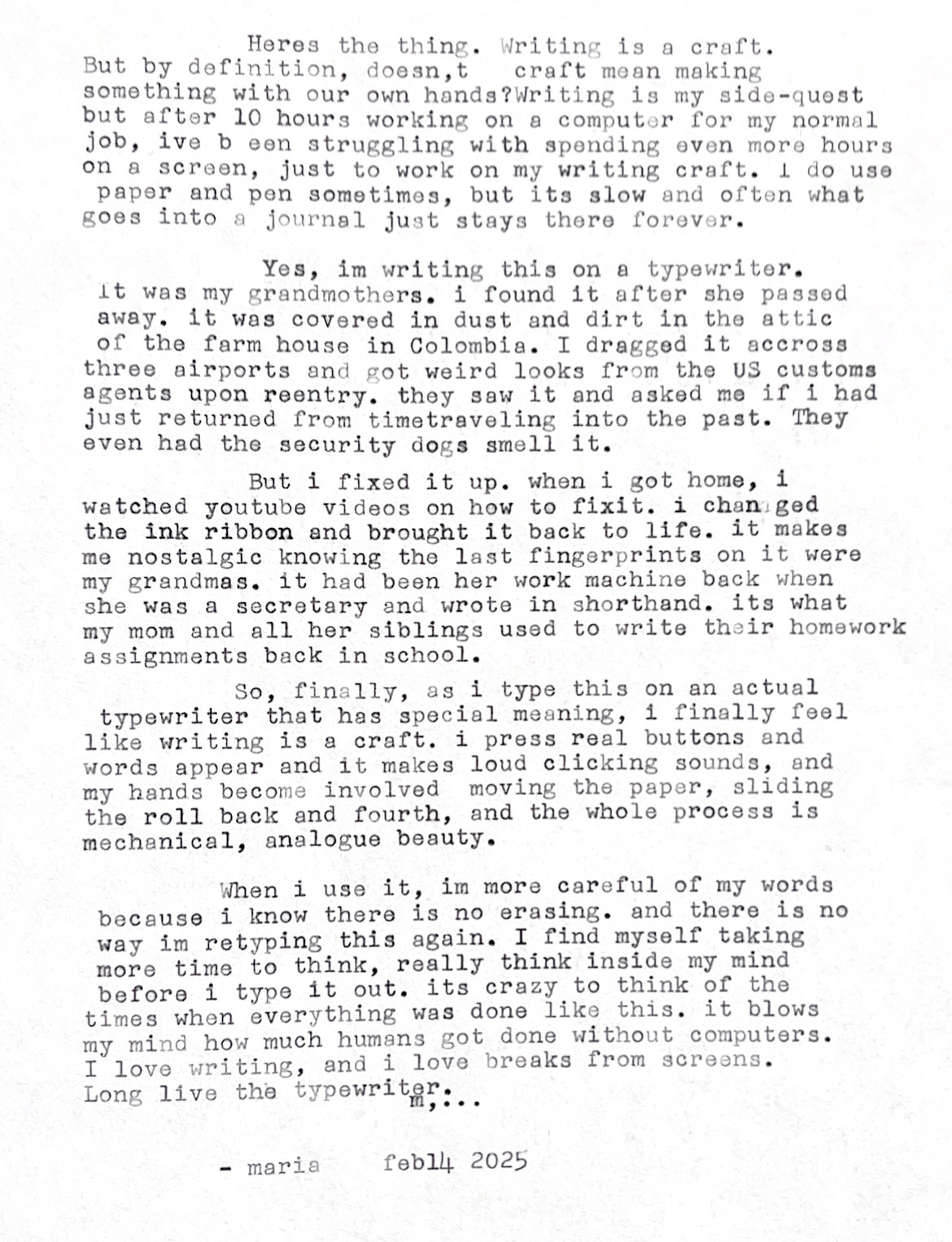 When I use it, I'm more careful of my words because I know there is no erasing. And there is no way I'm retyping this again. I find myself taking more time to think, really think inside my mind before I type it out. It’s crazy to think of the times when everything was done like this. It blows my mind how much humans got done without computers. I love writing, and I love breaks from screens.